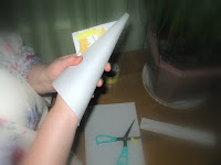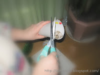 Використавши гумове кільце як лекало, фломастером проводимо лінію відрізу. Стараємось зробити так, щоб площина основи конуса була перпендикулярною його осі, від цього залежить наскільки рівно стоятиме ялинка.