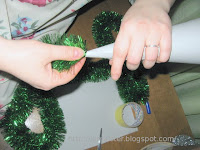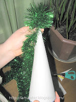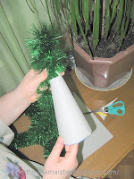 Робимо петельку на верхівці ялинки і по спіралі, рівномірно намотуємо мішуру на конус до самого низу.