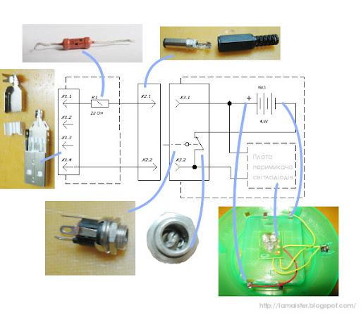 Резистор R1 впаюємо прямо у USB роз'єм. Він захистить порт від перевантажень. Величину опору вибрано з таких міркувань: